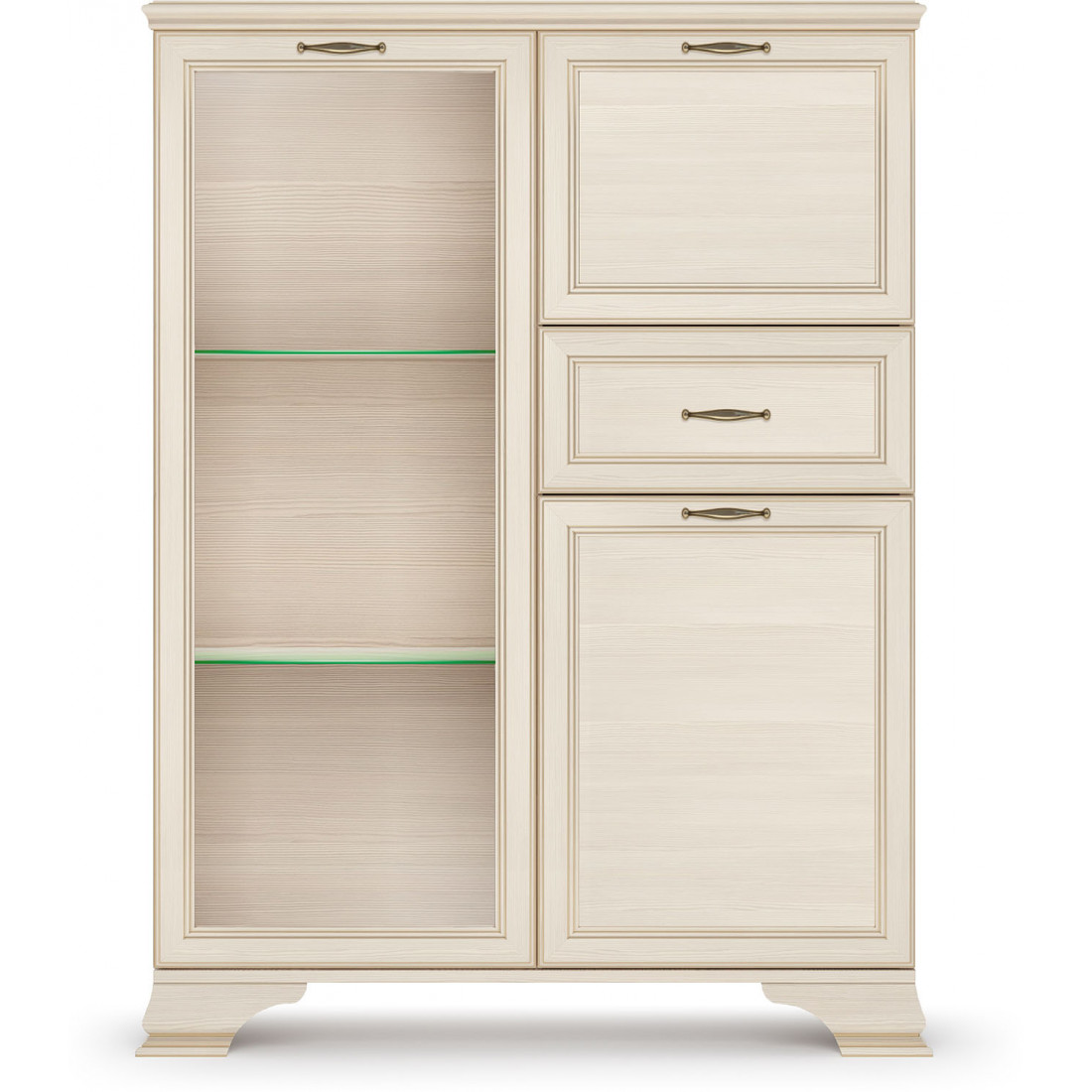 Коллекция производится в текстуре «бодега белый» с эффектом золотого патинирования. Облик «Сиены» дополняют рамочные фасады и карниз в классическом стиле, а также эффектные опоры из МДФ. Мебель комплектуются металлической лицевой фурнитурой премиум-класса в цвете «старая бронза» и надежной крепежной фурнитурой.