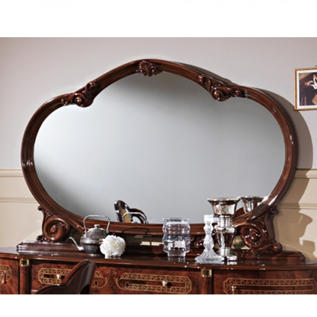 Зеркало для комода Роза (могано) от Российской фабрики «ДИА мебель», выполнено в элегантном цвете могано. Зеркало имеет красивую и нестандартную форму и будет отличным дополнением к комоду любой ширины.